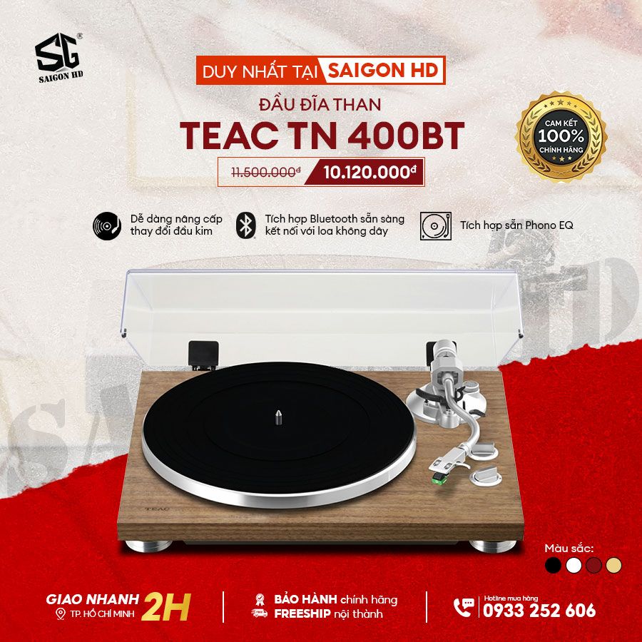 Đầu đĩa than TEAC TN-400BT có 5 màu sắc bao gồm: nâu sáng vân gỗ, nâu, đỏ, xám đậm, xám nhạt đủ để phù hợp với mọi sở thích cá nhân của bạn.